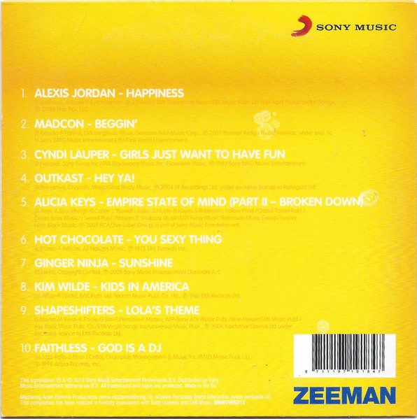 Subtitle: ‘Splashing Singalongs!’ A free giveaway at Zeeman stores, comes in cardboard sleeve. 1. EMI Blackwood Music/EMI Music Publ. Ltd./EMI April Music/Stellar Songs, ℗ 2010 Star Roc LLC. 2. EMI Longitude Music/Seasons Four Music Corp., ℗ 2007 Bonnier Amigo Music Norway, under excl. lic. to Sony BMG Music Entertainment BV/First World Entertainment. 3. Sony Tunes Inc./EMI Blackwood Music Inc./Novelene Music, ℗ 1983 Sony BMG Music Entertainment. 4. Chrysalis Music/Gnat Booty Music Inc., ℗ 2004 19 Recordings Ltd. under exclusive license to Ronagold Ltd. 5. Lellow Prod./Global Talent Publ./Carter Boys Music/J Sewell Publ./Masani El Shabazz Music/EMI Foray Music/Robinson Music Group/Twenty Nine Black Music, ℗ 2009 RCA/Jive Label Group, a unit of Sony Music Entertainment. 6. All Nations Music, ℗ 1975 EMI Records Ltd. 7. Copyright Control, ℗ 2009 Sony Music Entertainment Denmark A/S. 8. RAK Publ. Ltd./Rickim Music Publ. Co. Ltd., ℗ 1981 EMI Records Ltd. 9. AFP-Sony ATV Music Publ./Blue Flower/EMI Music Publ./Pay Back Music Publ. Co./EMI Virgin Songs Inc./Universal Music Publ., ℗ 2004 Nocturnal Groove Ltd under exclusive license to EMI Records Ltd. 10. Champion Management & Music Inc./BMG Music Publ. Ltd., ℗ 1998 Arista Records, Inc. This compilation ℗ & © 2012 Sony Music Entertainment Netherlands B.V. Distributed by Sony Music Entertainment Netherlands B.V. Made in the EU Issued in a cardboard sleeve.