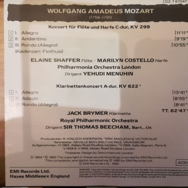 Wolfgang Amadeus Mozart – Konzerte Für Flöte Und Harfe • Klarinette (1990) – Very Good Plus (VG+)